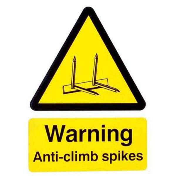 Small Anti Climb Spikes warning signs in a money saving pack of 10. Remember that its often a legal requirement to present appropriate warning signs when using anti climb spikes.